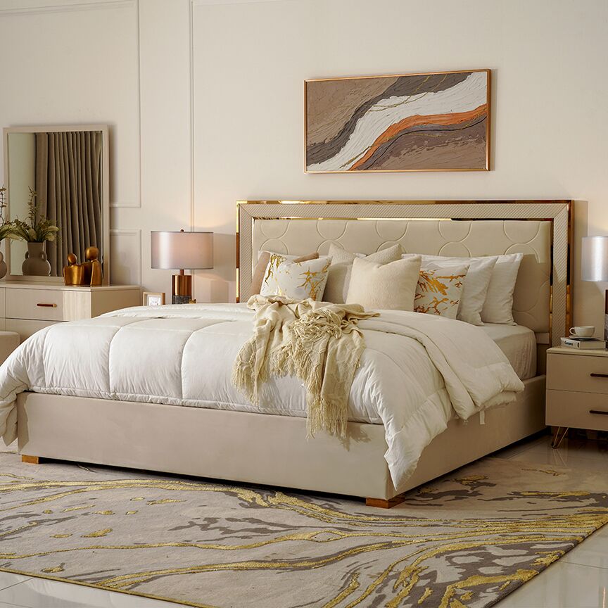 Elevate your bedroom with this stylish and durable bed, where modern design seamlessly integrates with the soft texture of premium fabric and the reliability of MDF construction.