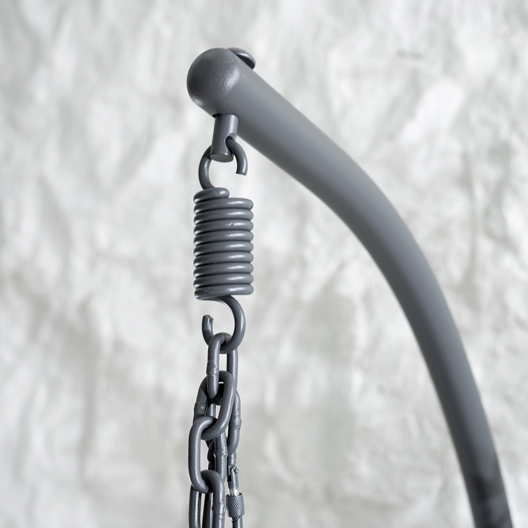 The Sereno swinging chair in sand brings serene comfort and timeless charm—crafted for effortless relaxation with a soft, soothing sway.
