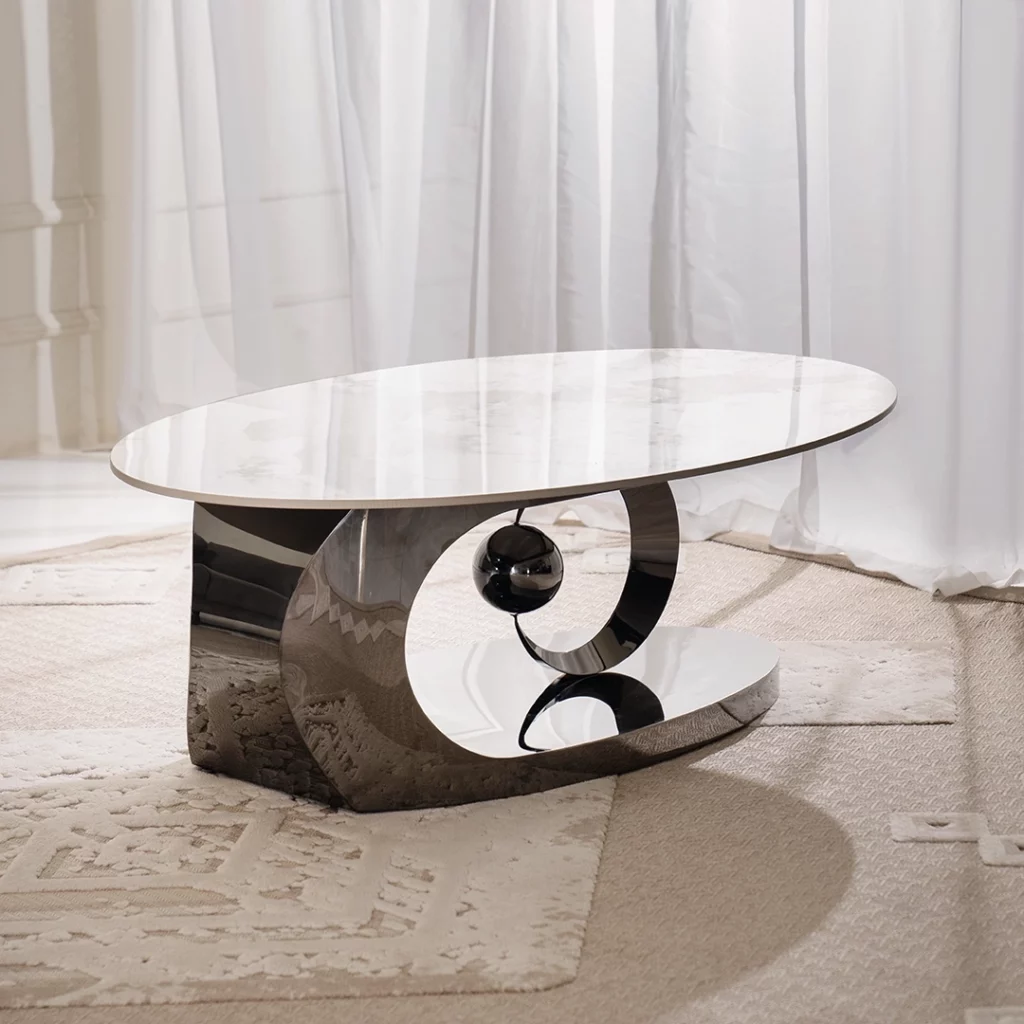 The Sindel Coffee Table is a stunning blend of elegance and modern design. It features a synthetic snow-white marble top that exudes a clean, luxurious aesthetic.