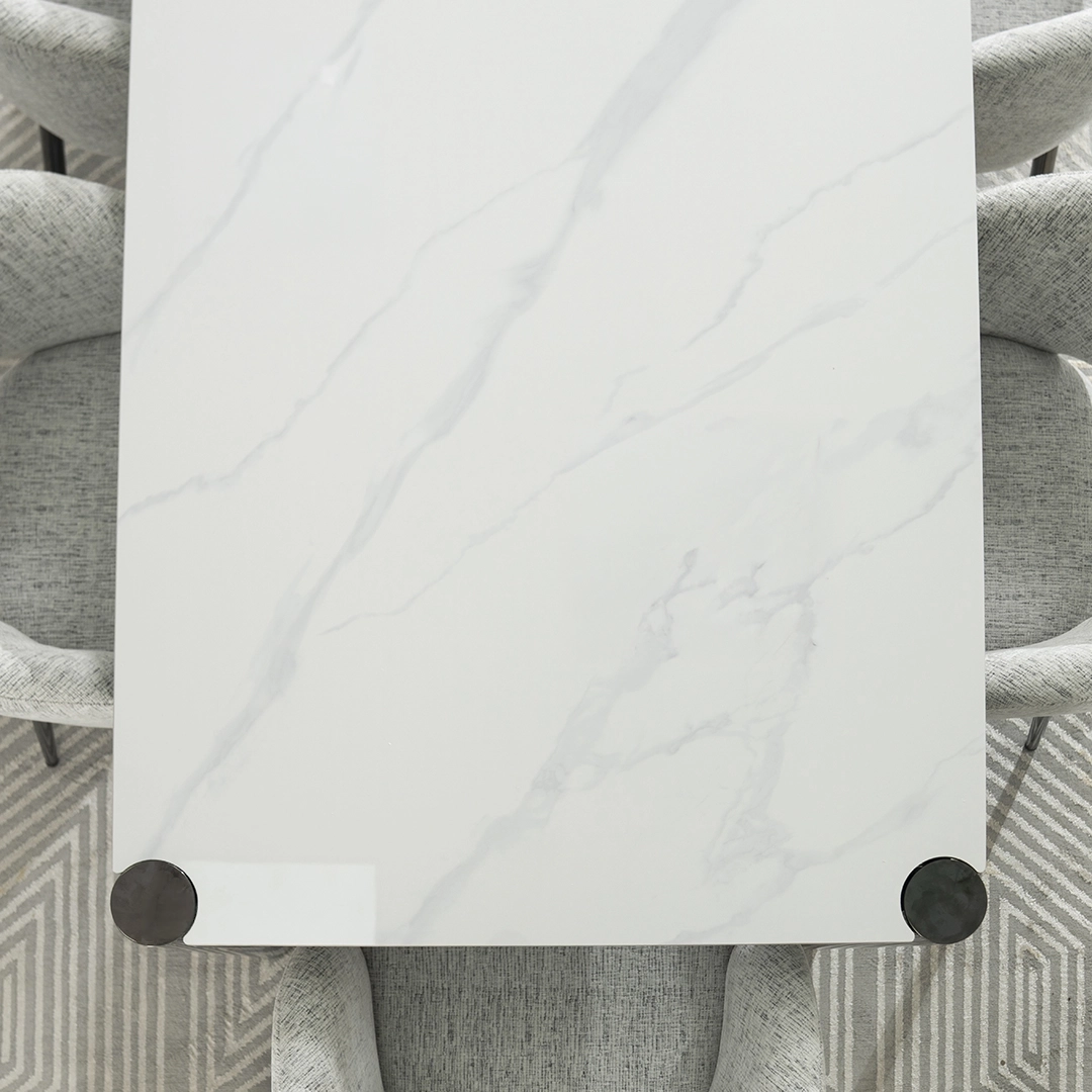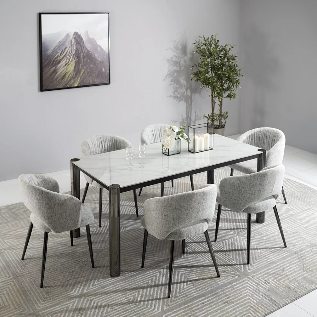 Finished with a Glossy finish, the set is highlighted in a timeless White & Grey color palette, adding a sense of brightness and refinement to your home. The spacious table provides ample room for meals and gatherings, while the upholstered fabric chairs ensure comfort and style for your guests.