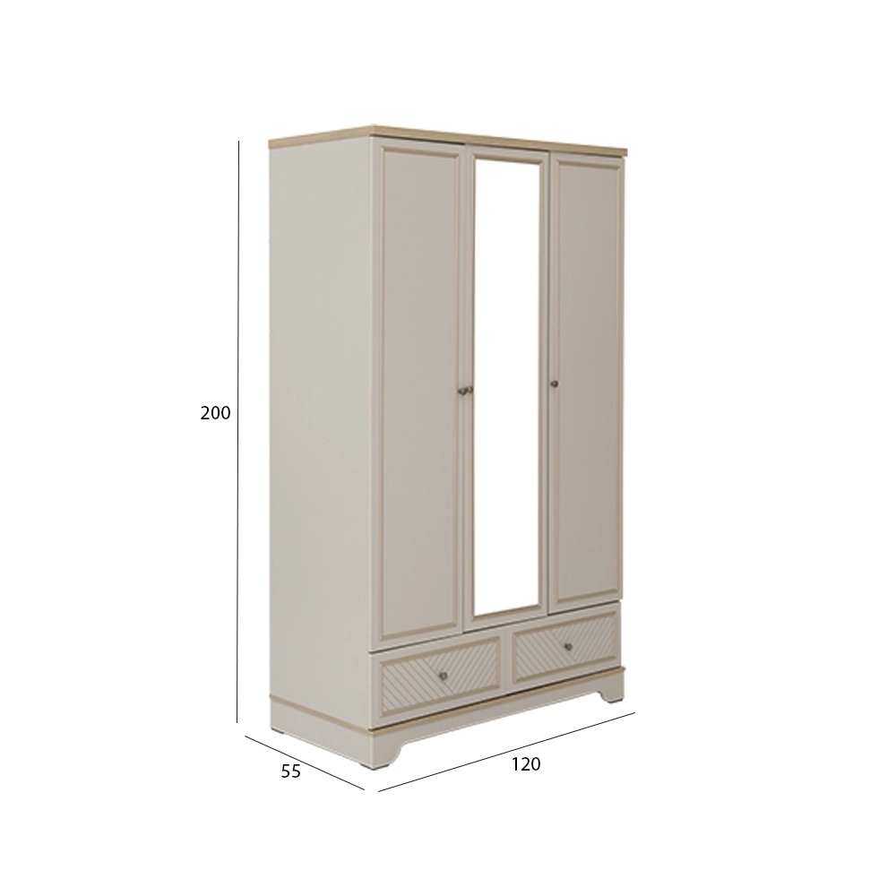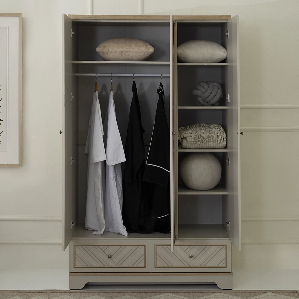 The wardrobe offers generous storage for clothing and other items, with a combination of hanging space and shelves.