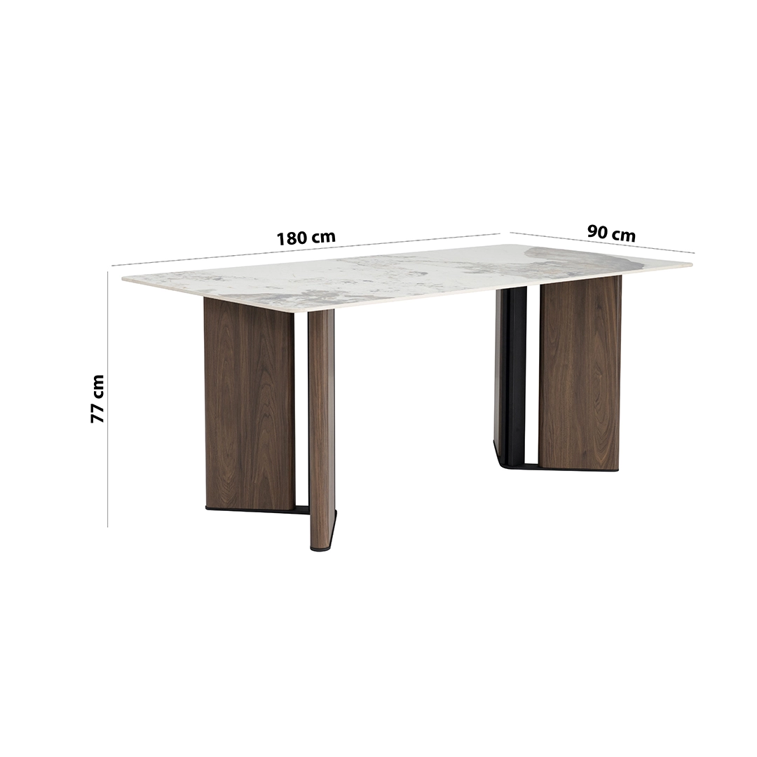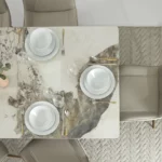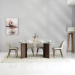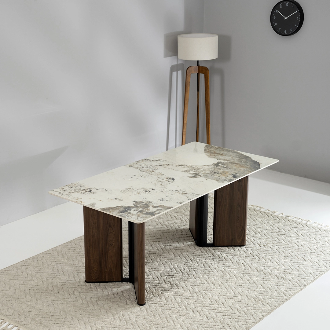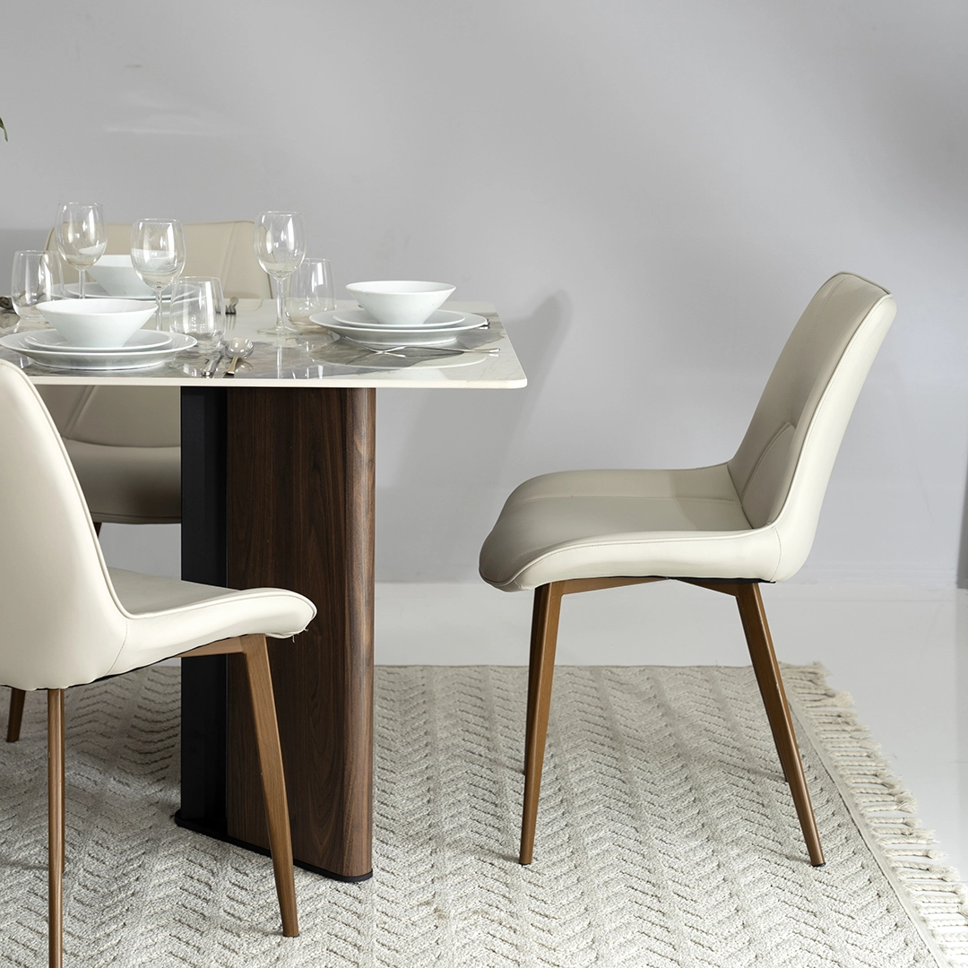 At the heart of the Stoneware Dining Set lies the Sintered Stone top, a durable and luxurious surface that elevates the dining experience. Paired with Metal framework, the table ensures longevity and stability, while exuding modern charm.