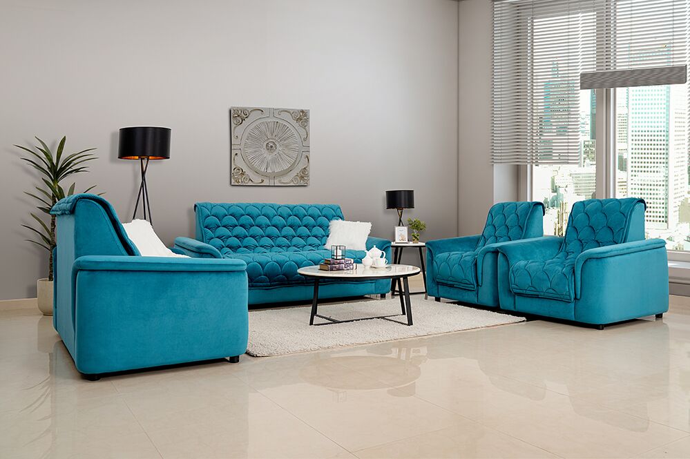Indulge in the luxurious comfort of the Sunday Sofa Set, a stylish 6-seater ensemble adorned with sophisticated fabric upholstery.