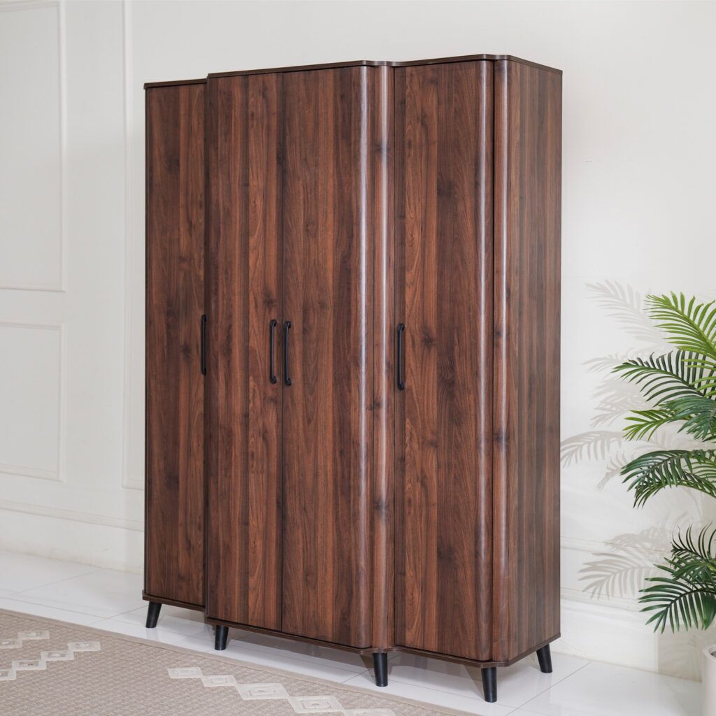 The Suzanne is a 4-door wardrobe finished in a Walnut color — shade that blends easily with modern or contemporary bedroom décor. It offers a practical solution for organizing clothing while saving space.