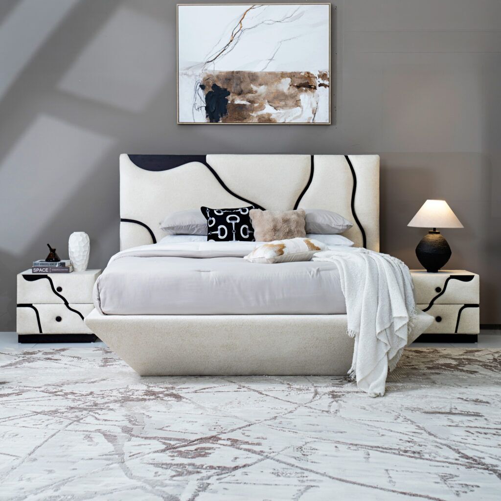 The Lava Bed blends comfort and elegance, featuring a soft upholstered frame and a refined design that enhances any bedroom with a touch of sophistication.