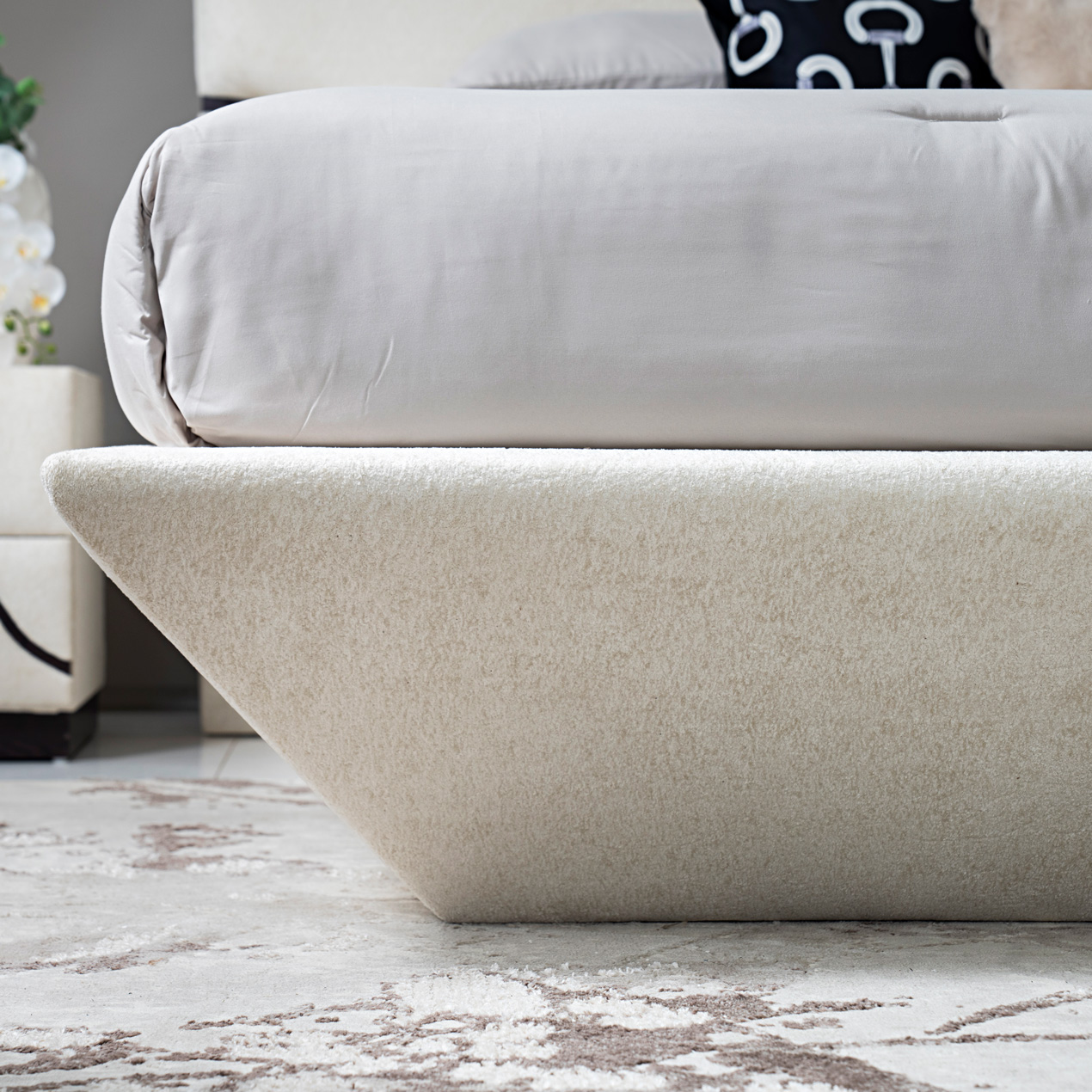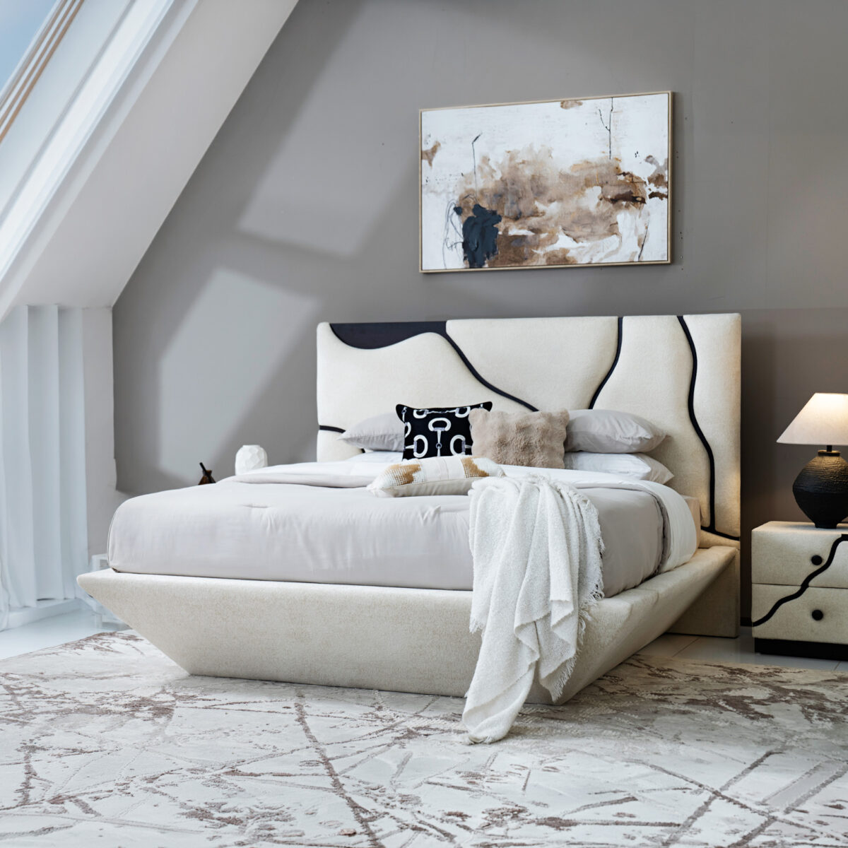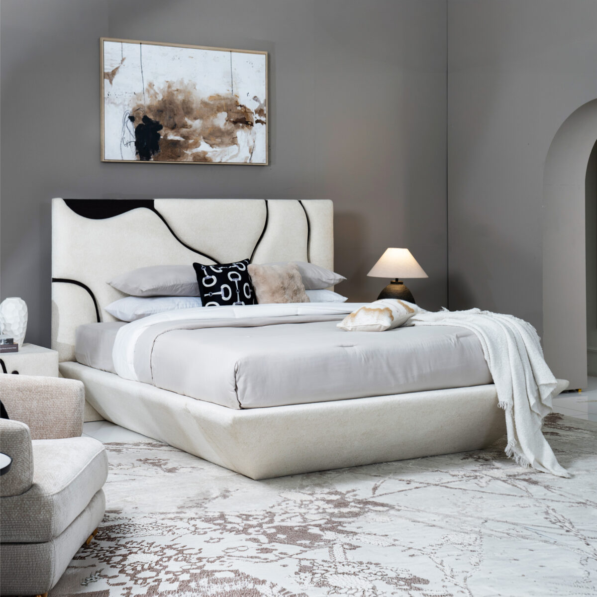 The Lava Bed blends comfort and elegance, featuring a soft upholstered frame and a refined design that enhances any bedroom with a touch of sophistication.