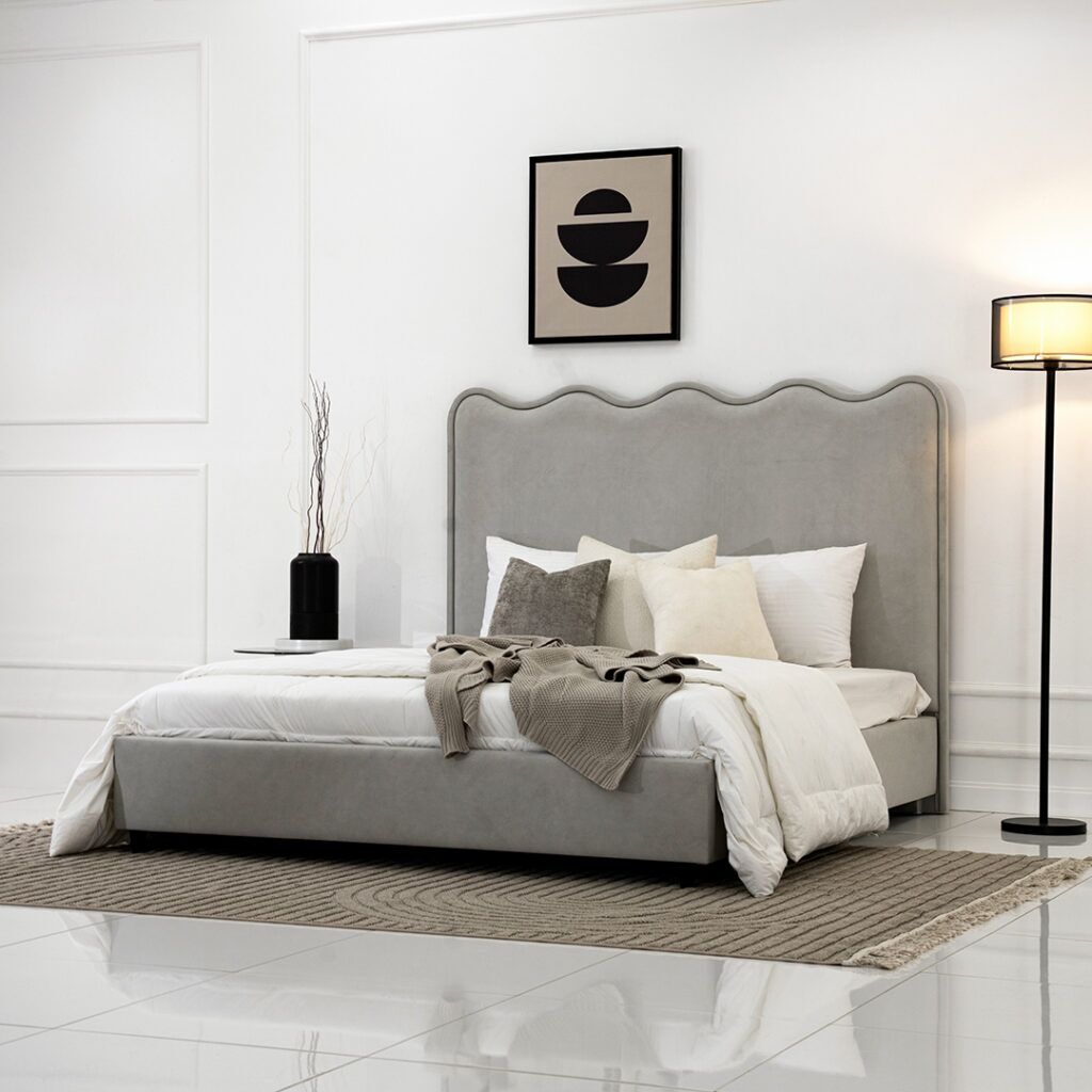 The Wave upholstered bed offers a perfect blend of style and comfort, with a plush padded frame and a sleek fabric finish for a refined bedroom look.