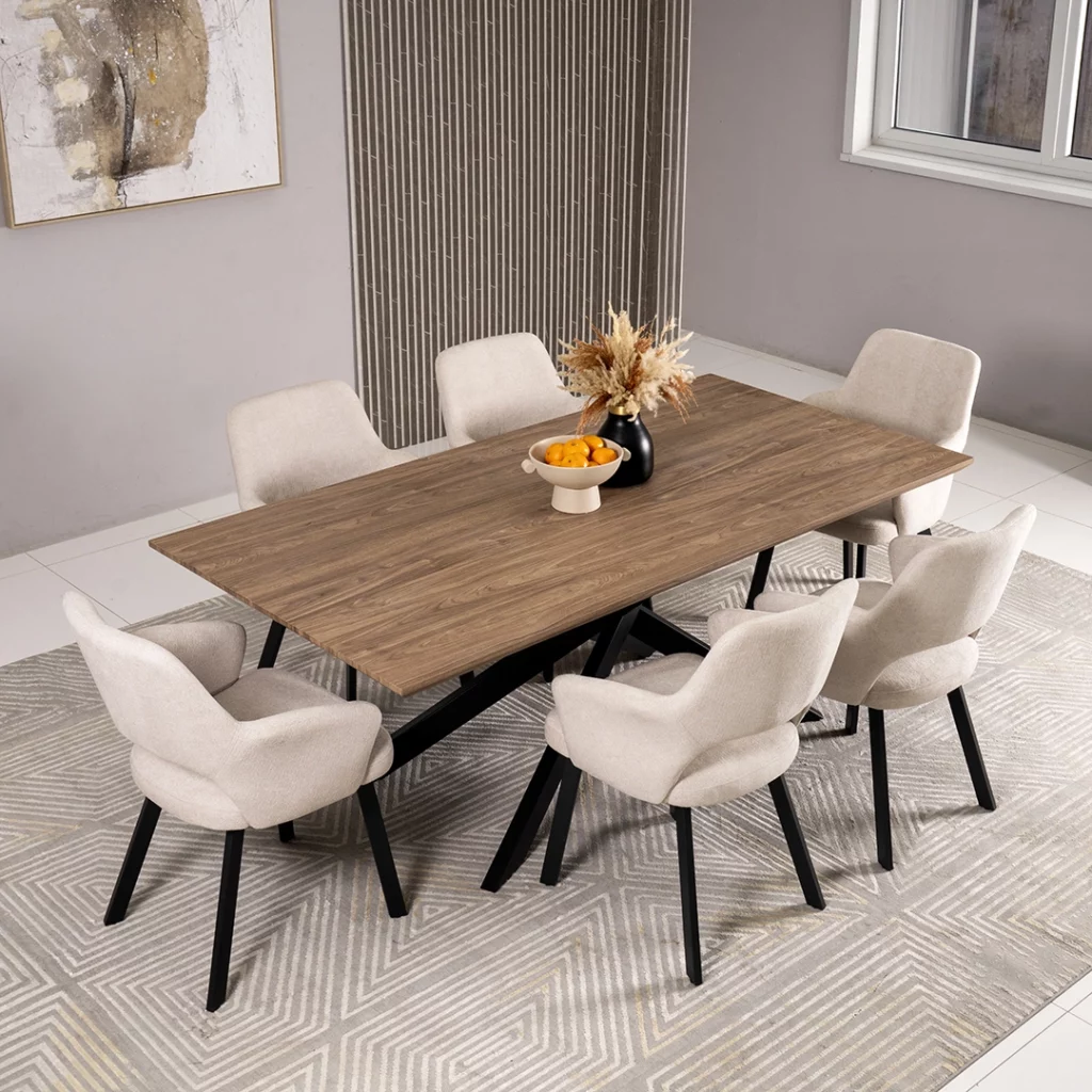 The Tom dining set offers elegant seating for six, combining comfort and practicality to create a refined dining experience.