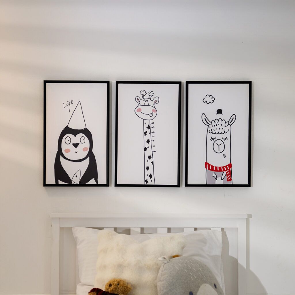 The “Verdant Set of 3 Kids Canvas Wall Art” is a playful and enchanting collection designed to bring the magic of nature into a child’s room.