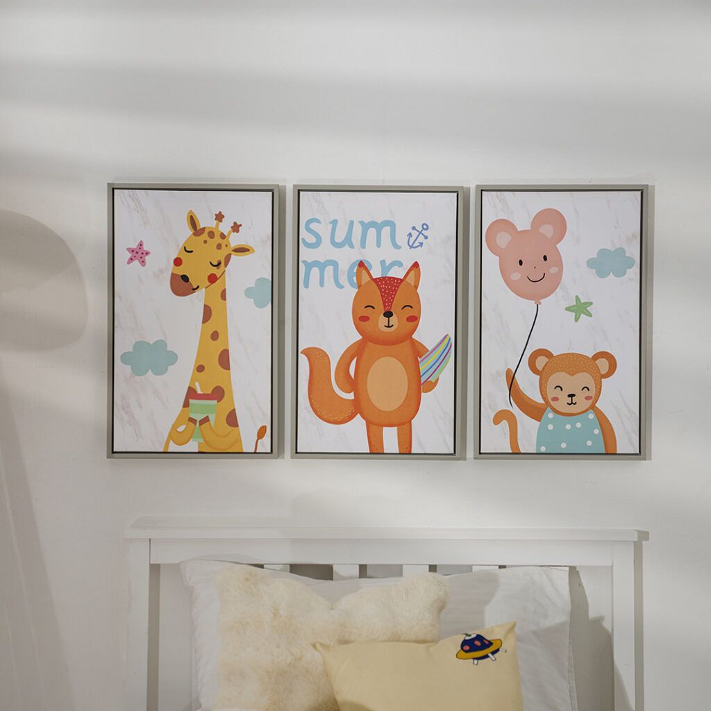The “Verdant Set of 3 Kids Canvas Wall Art” is a playful and enchanting collection designed to bring the magic of nature into a child’s room.